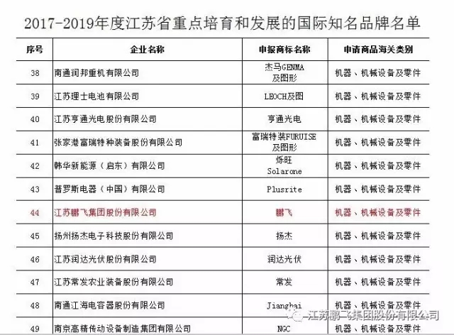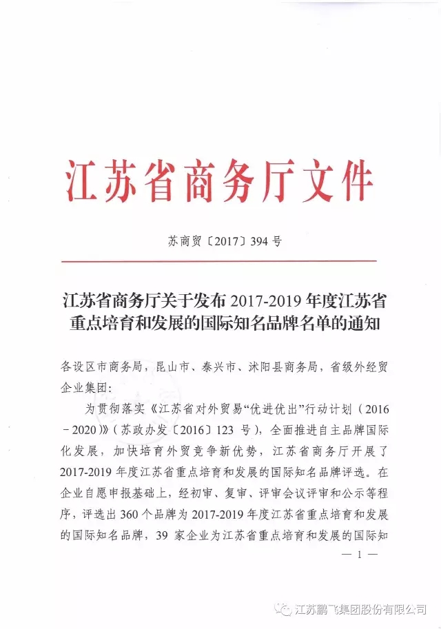 近日,省商務(wù)廳公布“2017-2019年度江蘇省重點(diǎn)培育和發(fā)展的國際知名品牌”名單,經(jīng)過層層評比,江蘇鵬飛集團(tuán)榮膺在列。