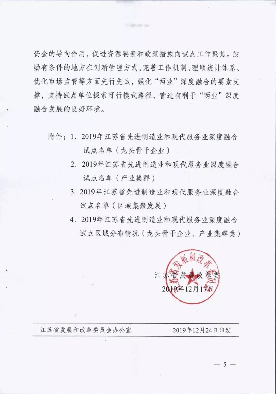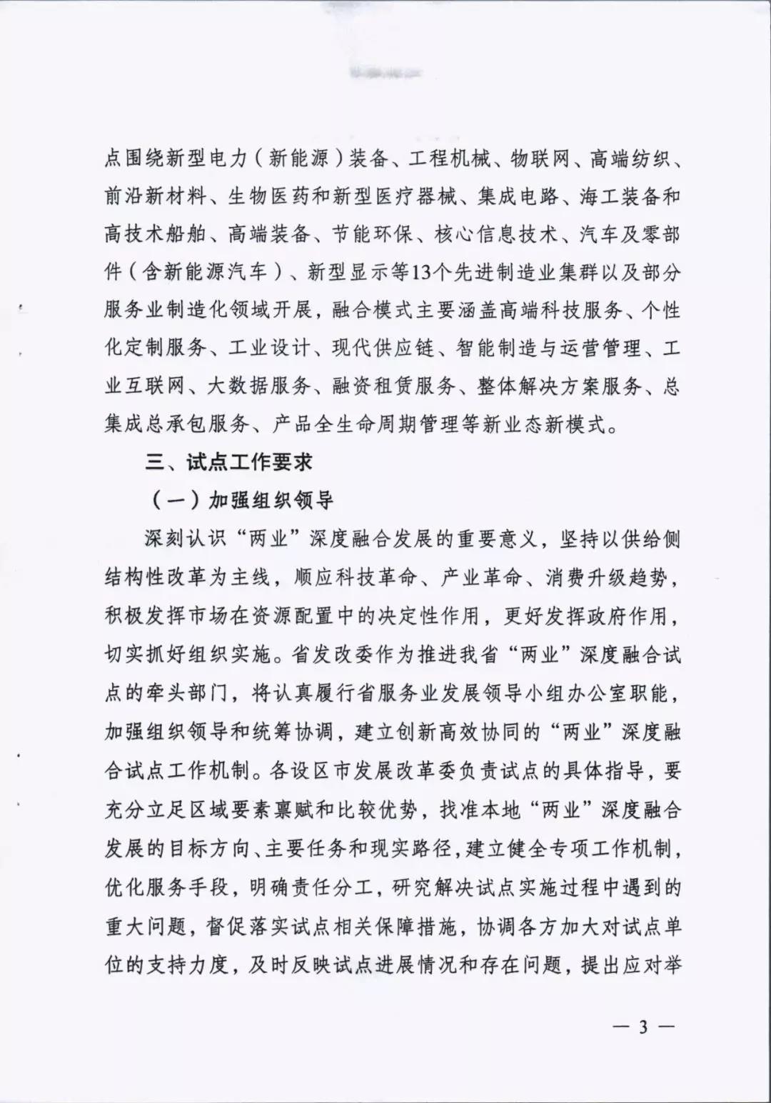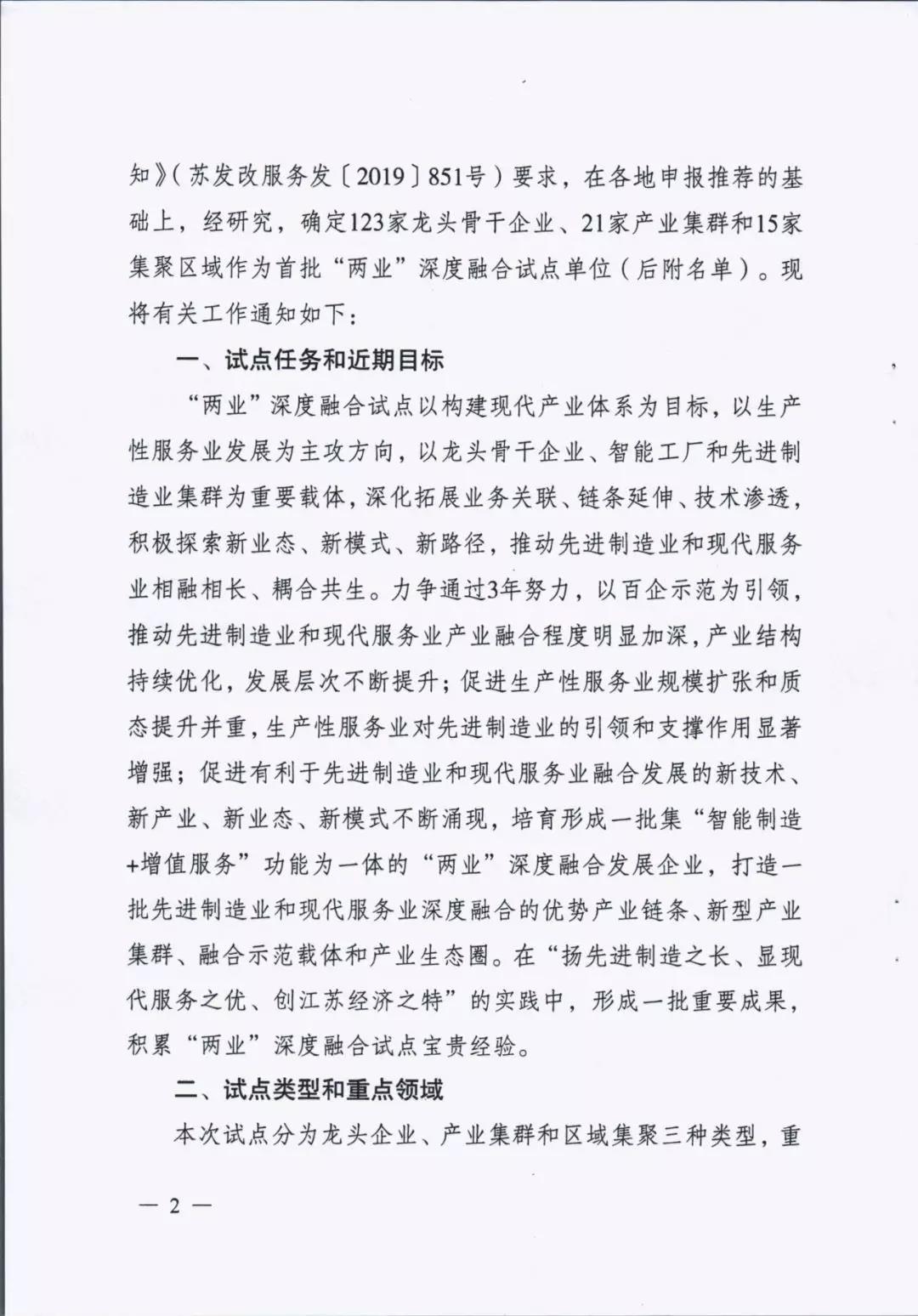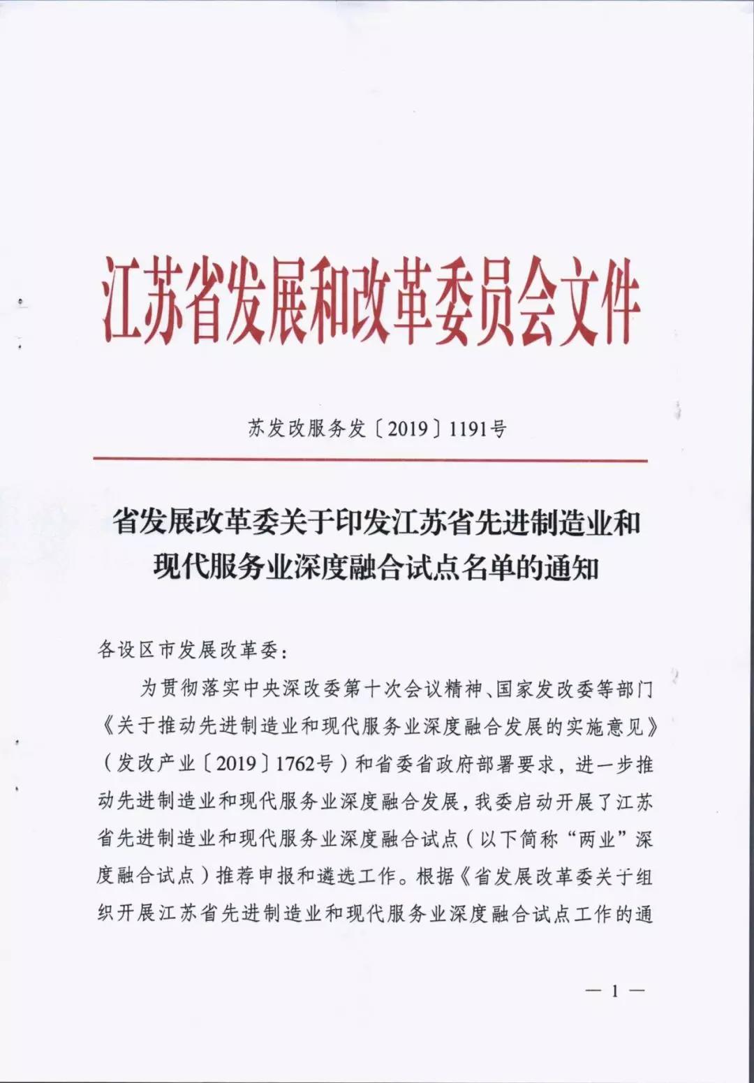 為貫徹落實中央深改委第十次會議精神、國家發(fā)改委等部門《關于推動先進制造業(yè)和現(xiàn)代服務業(yè)深度融合發(fā)展的實施意見》(發(fā)改產(chǎn)業(yè)〔2019〕1762號)和省委省政府部署要求,進一步推動先進制造業(yè)和現(xiàn)代服務業(yè)深度融合發(fā)展,我省啟動開展了江蘇省先進制造業(yè)和現(xiàn)代服務業(yè)深度融合試點推薦申報和遴選工作。根據(jù)《省發(fā)展改革委關于組織開展江蘇省先進制造業(yè)和現(xiàn)代服務業(yè)深度融合試點工作的通知》(蘇發(fā)改服務發(fā)〔2019〕851號)要求,在各地申報的基礎上研究確定123家龍頭骨干企業(yè)、21家產(chǎn)業(yè)集群和15家集聚區(qū)域作為首批“兩業(yè)”深度融合試點單位。我市江蘇鵬飛集團股份有限公司大型成套裝備總繼承總承包融合試點、鑫緣繭絲綢集團股份有限公司繭絲綢全產(chǎn)業(yè)鏈產(chǎn)品生命周期管理融合試點、中國天楹股份有限公司智慧城市環(huán)境管理系統(tǒng)應用總集成總承包融合試點共三家企業(yè)入選試點名單。
